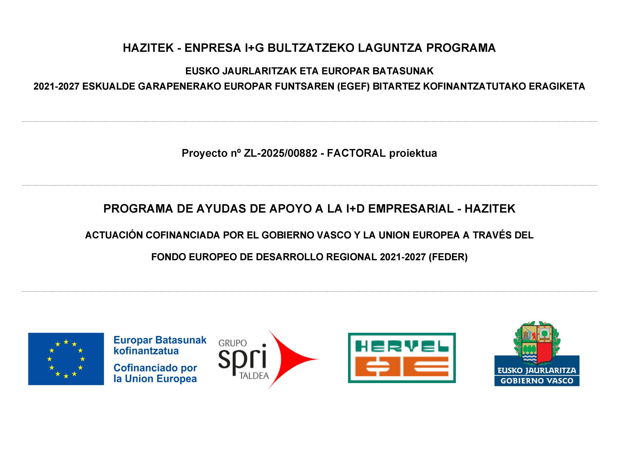 HERVEL PARTICIPA EN UN PROYECTO DE I+D SUBVENCIONADO POR EL PROGRAMA HAZITEK 2025, APOYO A LA I+D EMPRESARIAL FACTORAL.Expediente: ZL-2025/000882 Tipo de proyecto: Investigación Industrial Anualidad: 2023 Este proyecto ha sido cofinanciado por el Gobierno Vasco y la Unión Europea a través del fondo europeo de desarrollo regional 2021-2027 (FEDER).