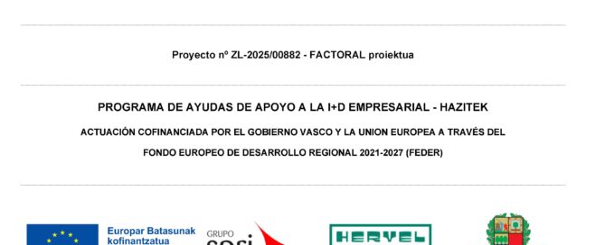 HERVEL PARTICIPA EN UN PROYECTO DE I+D SUBVENCIONADO POR EL PROGRAMA HAZITEK 2025, APOYO A LA I+D EMPRESARIAL FACTORAL.Expediente: ZL-2025/000882 Tipo de proyecto: Investigación Industrial Anualidad: 2023 Este proyecto ha sido cofinanciado por el Gobierno Vasco y la Unión Europea a través del fondo europeo de desarrollo regional 2021-2027 (FEDER).
